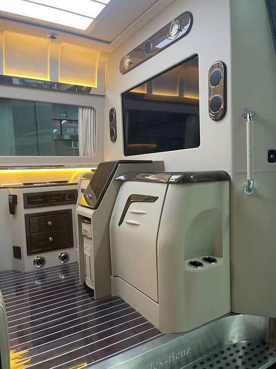 经典款的7+2版内饰设计以舒适为主,为乘客提供宽敞的座位空间。而带吧台茶台的7座版则结合了商务与奢华,满足商务会客和休憩的需求。对于喜欢出门旅游的用户,带卫生间带简易厨房的6座旅居版能够提供更多便利和舒适。此外,进口奔驰斯宾特的内饰改装定制颜色方面更是能根据客户的需求进行任意定制,为用户打造独一无二的豪华空间。