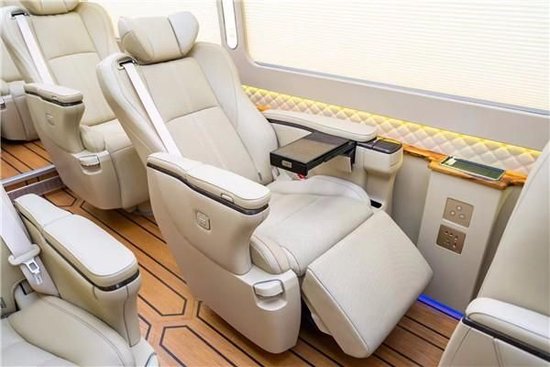 丰田考斯特改装12座内饰的设计不仅时尚甚至比那些外观上夸张的车还有张狂。在内饰的设计上,彩色的灯光设计以及KTV的影音系统的打造,更可以根据自己的需要设计酒柜。这样的内饰的设计既能够给人们一个轻松愉快的旅行,同样也可以为丰田考斯特12座的设计上展现出更多的时尚元素。丰田考斯特车内的窗帘的设计上丰田考斯特也充分考虑了内饰设计的独特性,豪华的布艺窗帘以及大气的电动百褶窗帘,华通丰业丰田考斯特改装商务车在内饰设计上充分展示出了自己大气的风格设计。
