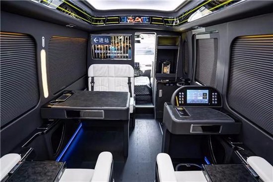 丰田考斯特在改装方面更加注重商务旅行中办公的实用性。车内的真皮航空,电动调节装置可以让您自行调节最舒适的空间距离、靠背以及脚托的角度,特殊的座椅构造,增加腰部的支撑,宽敞的空间让您的双腿收放自如,忘却旅途的紧迫感,体验如家般的感觉,缓解您在行车旅途中的疲劳。丰田考斯 特 改装内饰增加豪华高档办公桌以桃木及真皮为材料,打造最舒适高端使用的办公环境。