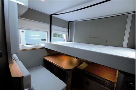卡座背后还有一台网络液晶电视配有4G盒子,使得旅途生活更加精彩。卡座的靠背采用略带角度的设计,可以提供良好的长途体验;黑夜笼罩大地准备休息时可将桌子降下来与卡座组合一张1900*1050(mm)的小双人床,两个成年人休息略挤,更加适合两个小朋友。顶部配有的天窗既作为采光用途同时是逃生窗,还可以通过这里登上车顶平台,当然也可通过主驾驶一侧的爬梯。
