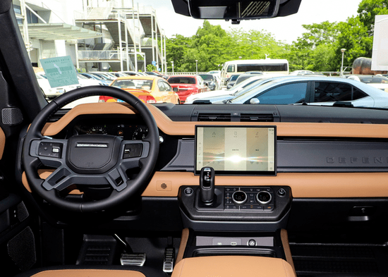 进入路虎卫士车内,提供双色方案,黑棕色混搭看上去辨识度极高。中控区域方向盘尺寸不小,如果是女生开会觉得有一些吃力,本身是真皮材料,并且支持方向盘记忆功能,而在正前方我们可以看到彩色的12.3英寸全液晶仪表屏,从科技功能上来看,提供HUD抬头显示。中控屏幕则采用嵌入式设计,尺寸在11.4英寸,提供车联网以及手机互联,本身就内置高德地图,不连接手机同样可以很方便。如果出去越野,音响效果是我们经常会参考的地方,本身具备14个扬声器,音响品牌来自英国之宝,品质不错。