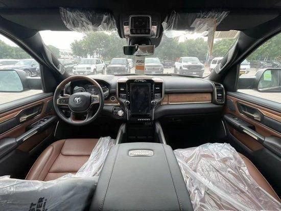 全新道奇公羊长角号在你打开车门的一瞬间,你就能够感受到这款皮卡的豪华感扑面而来,肉眼能够看到的地方几乎全是皮革材质,仪表板、车门把手、门饰板都是百分百全粒面皮革。对于座椅还是有些许不同,座椅表面还镶嵌有鳄鱼浮雕图案,手套箱以及中控台等处也均有这样的铭牌标记,时刻提醒你这款皮卡身份的高贵。此外,一些细节点缀均采用镀镍的形式,并且为了与长角号这个名称更为贴切,车内多处采用了实木材质
