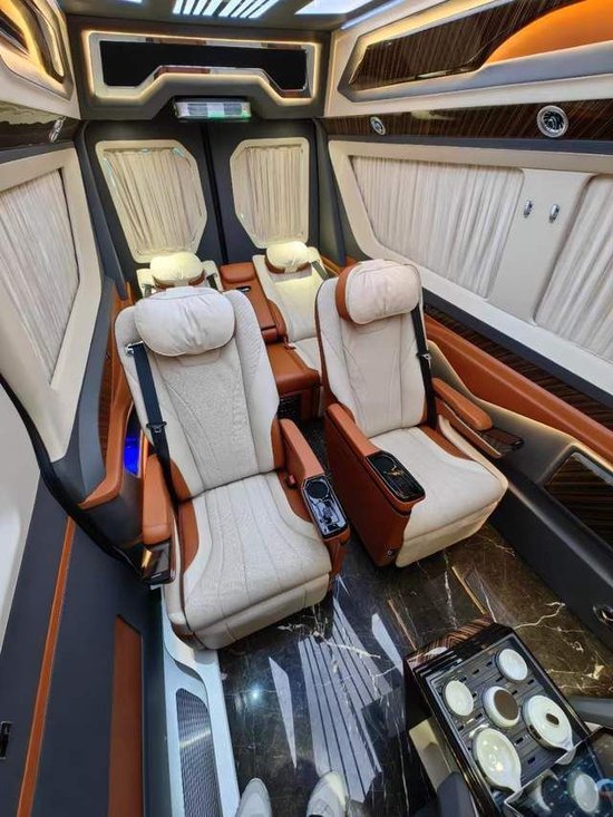豪华真皮座椅可以前后、左右调节、加热、电动按摩,同时可以调节靠背、腿拖等。德国进口三折手动沙发床,座椅与大床之间切换自如,操作简单,豪华大床的真皮触感舒适,营造良好的车内休息睡眠环境。