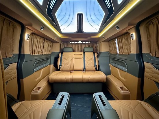 商务舱整体的装饰还是很豪华,细节之处都能体现整车的质感。在内饰颜色上,现车是以浅棕和深咖双拼配色,当然,其他的不同选择也是可以根据自己的喜欢进行私人定制的。图中为深邃摩卡 (配置|询价)款。顶部重新打造的是高达顶灯,多色可以调节,更稳定,抛开了花里花哨的装饰,更多的是稳重大气为主,彰显着商务车的用途和细节。