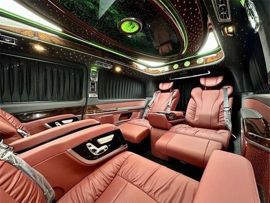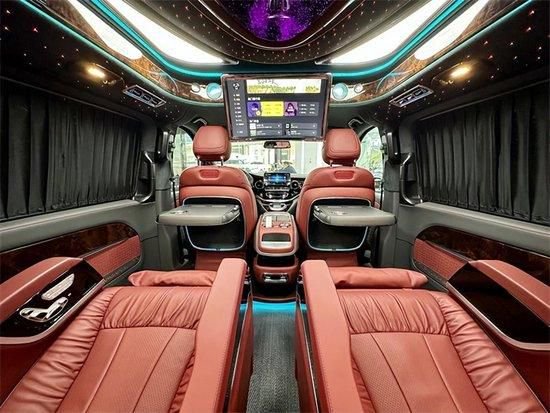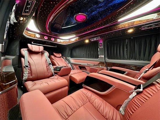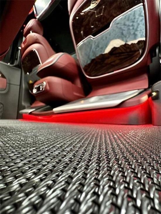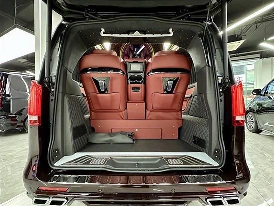 整车座椅采用纳帕真皮+手工编织工艺包覆,中排航空座椅带多向电动调节,有电动腿托、按摩、通风、加热功能,而且支持360度旋转,家庭旅游、商务办公,完美把控。纳帕真皮航空座椅、三排宽敞沙发床,24寸悬浮曲屏电视、柏林之声18声道音响系统等等,曼妙高品质音乐,坐在车内听歌就是一种享受!