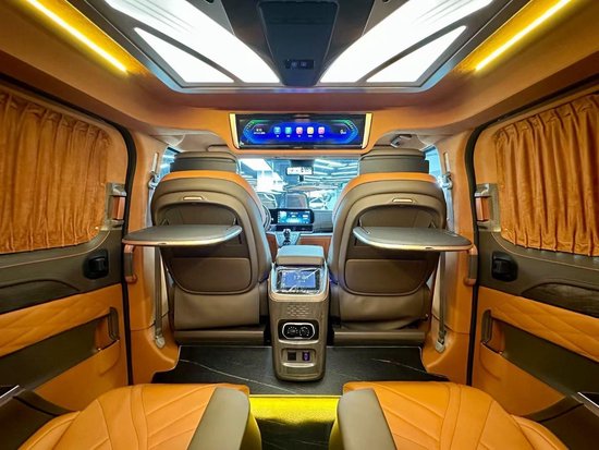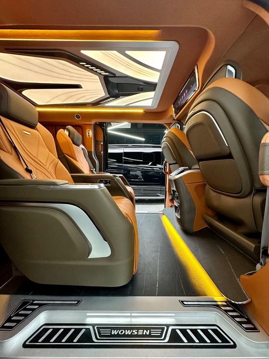 在商务舱,也是配置满满,顶部无线网络电视机,连接网络就可以使用啦,看电视,看节目,效果那也是相当不错的。而且配有7.1声道的vv-car的环绕音响,听个音乐也是一种享受。顶部顶灯也还有多个颜色可以调节,能够适应不同的车内环境。整车作为商务车用车,在细节上做的很好。比如周边的窗帘,车窗开小窗,壁柱的氛围灯,侧墙的包覆性,一眼看上去,品质是非常在线的。顶部的出风口也是涡轮的,以及可以随门控制的氛围灯光,都是相当的到位。