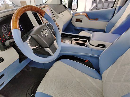 内饰蓝米双拼配色,中排宽敞超大的空间,满足大佬对空间的极致要求。地板选用新款编制地板,优雅大气。进门处铝合金丰田专用踏板豪华尊显。