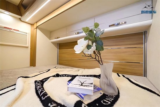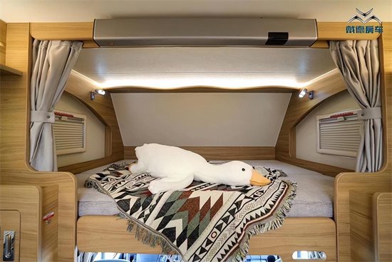 得益于戴德在额头设计上的革新,CareFree恺丰房车的额头床空间相当的大,尺寸达到了2220x1330毫米,并且内部高度较大,让乘客能够舒适的在额头床活动。车载32英寸小米智能电视采用翻折方式安装在床下,而条形立体声音响则集成在顶部,整体设计语言相当和谐。