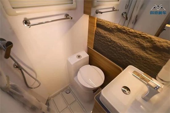 卫生间内部并没有完全采用纯白设计,而是将一侧的墙面装饰成峡谷风,增加观赏层次。内部配备有多美达抽拉马桶、独立淋浴系统、镜面浴室柜陶瓷方盆、漱口双杯架、加宽玻璃钢底托、房车专用带灯换气扇、折叠晾衣杆等。水路系统方面,配有300L净水箱+117L灰水箱。
