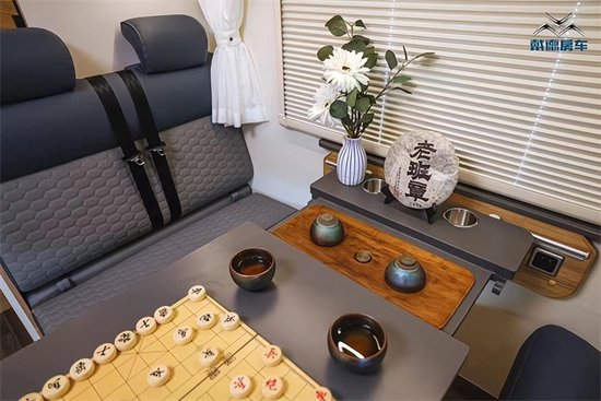 卡座区采用了四人对坐的布置形式,皮质沙发带来了出色的乘坐舒适度。此外,卡座配有独立安全带及独立头枕,进一步增强舒适坐感。卡座桌可放下,将卡座区变为一张尺寸为1900x945毫米的床铺,拓展了车内睡眠空间。