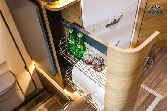 尾部拓展仓打开后,卧室区的空间得到了很好的展现。拓展仓的床铺尺寸为2.22m×1.23m,可以同时满足两大一小的睡卧需求。左右两侧配有外推窗,方便卧室区域的通风和透光,床铺上方还配置了三个储物吊柜,可以收纳一些小件衣物。睡卧区和生活区采用隐私帘进行分隔,能后为乘客提供很好的独立空间。