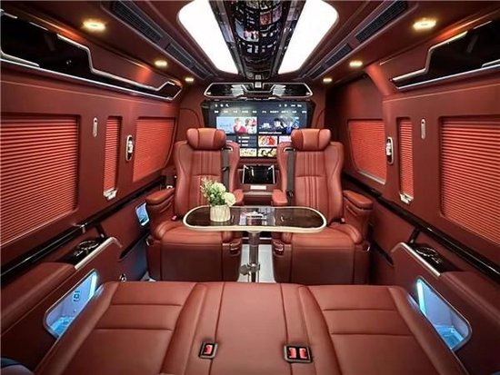 华通丰业丰田(进口)海狮-HIACE驾驶舱升级9寸导航,搭配360度全车影像,红木方向盘,升级了原厂桃木纹内饰改为进口红木,豪华感顿显。华通丰业主副驾驶座椅真皮包覆,主副驾驶座椅四向电动调节带通风加热,华通丰业主副驾驶中间升级车载扶手冰箱。