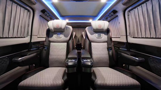 2024款奔驰巴博斯B25乘客舱第二排多功能座椅,可旋转,并带有脚托功能,舒适乘坐,附有加热、通风、电动调节、腿托、按摩、记忆、电动头枕、电动靠背等功能,座椅支持180度旋转。