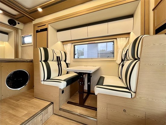 采用进口依维柯new daily底盘,搭载3.0T柴油发动机8速自动变速箱,最大功率132kW,最高输出180马力,扭矩高达430牛米,配备ABS+ESP9.2车身电子稳定系统,多功能方向盘、10.5寸中控屏,六轮胎压监测及倒车雷达等,驾驶舱主副驾驶座椅,采用NAPPA真皮包裹,底盘还配备有空气减震系统,保证了长途行车时的舒适性。