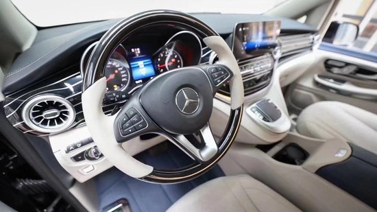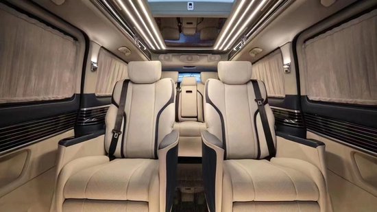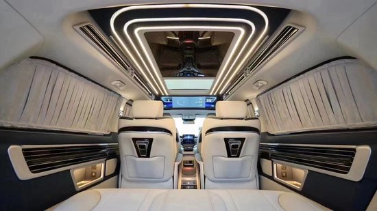 这台车为什么叫奔驰迈巴赫版VS680呢,主要是后舱的内饰和迈巴赫的原厂座椅。车身全部皮革包覆,檀木面板奢华点缀,牛皮地毯,迈巴赫宫格顶灯 。