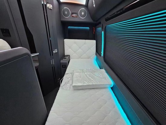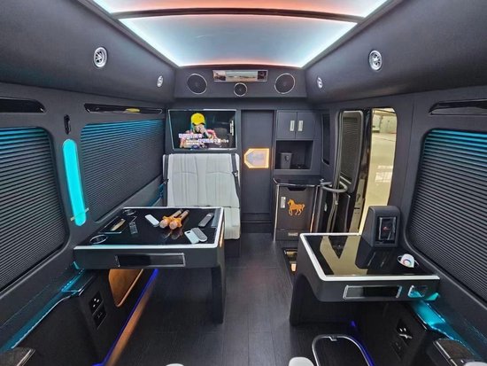再来看一下商务款的布局,作为商务用途的车辆,12座是最受欢迎的款式。既能保证空间性,也可以保证整体的舒适性,和出行的人数。也是全隔断的布局,有两个反向座椅,大屏的电视机,卡拉OK的功能全部具备,还能商务会议。作为商务款,主要作用就是接待用车,企业招待,自己出行的高规格配置,走在路上也是炸裂的存在。配置高,款式好,整车都是真皮包覆,侧墙每个作为都是有无线充电和五孔的插座。