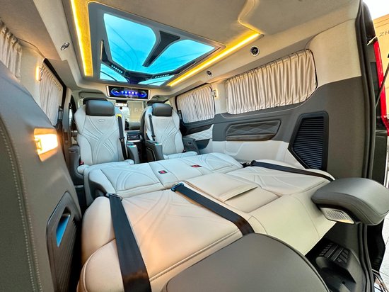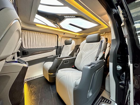 顶部是定制的高达顶灯,他有多款颜色可以随意的切换,明暗也可以自主调节。而且车内的无线充电也特别的多,在驾驶舱,后面的商务舱以及座椅上均有多处。商务舱的玻璃上均带有窗帘手动可以调节方面使用,而且能够很好地保护车内的隐私性除此之外,在中排的窗户上还单独的开了小床,以便于非常好的透气,再者就是随门儿洞的氛围灯上下车特别的具有仪式感。