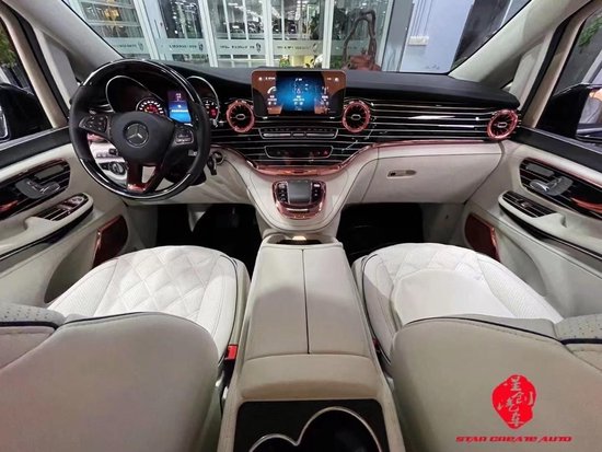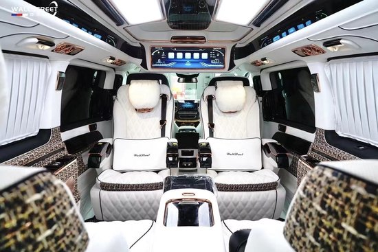 这台车为什么叫奔驰迈巴赫版V S680呢,主要是后舱的内饰和迈巴赫的原厂座椅。车身全部皮革包覆,檀木面板奢华点缀,牛皮地毯,迈巴赫宫格顶灯,以及绒质窗帘一应俱全,还有两张定制的迈巴赫总裁座椅,十分舒适豪华,通风加热,气压按摩,三段调节等功能加持。后排的沙发座椅可以放平成为双人床,尾车上出行人员提供舒适的休息。