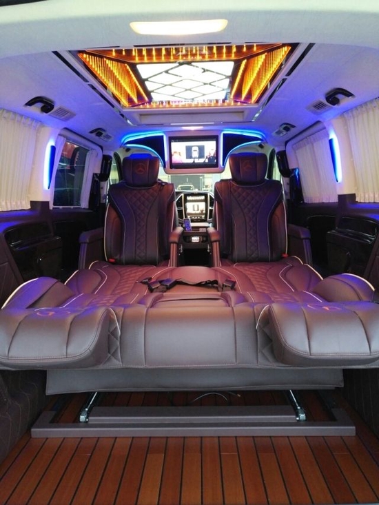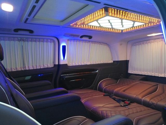 奔驰维特斯房车内部车舱的奢华和时尚感,除了是甄选饰材选料的装饰效果,还有一份灯饰照明的功劳。房车车顶棚采用麂皮绒包覆,两边氛围灯饰带环绕,中部迈巴赫宫格顶灯和奢华级星空顶灯组合,灯照效果异常通透明亮,富丽堂皇的皇家宫廷环境,更显得房车自身品质的尊贵和其高端商务气质。