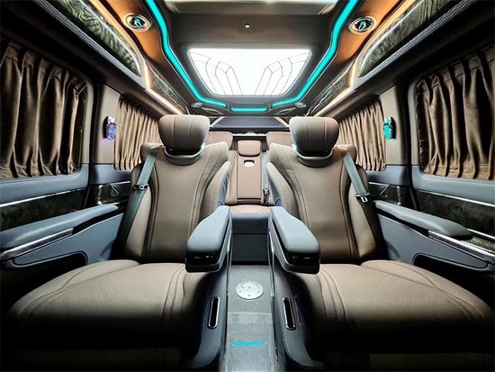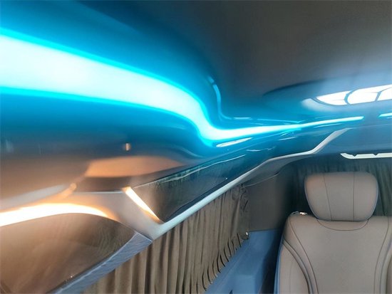 内饰双拼设计给人感觉大方沉稳又不乏味,上门的迎宾踏板采用防滑横纹磨砂铝,车内地板选用高密度碳布编织地板,顶部配有半隔断高清互联网电视搭配柏林之声音响系统给我们带来曼妙的旋律。
