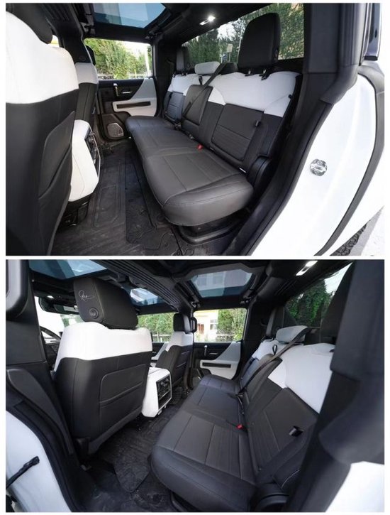 GMC Hummer EV 拥有无比坚硬的底盘护板,有效保护底盘中的电池组以及至关重要的传动部件。车头设计有巨大的前备箱,同时车顶三面大玻璃可自由拆卸,其中前排是左右贯通式,后排则是左右两个独立式的。当你把车窗降下,你会获得非常敞亮的头部空间。