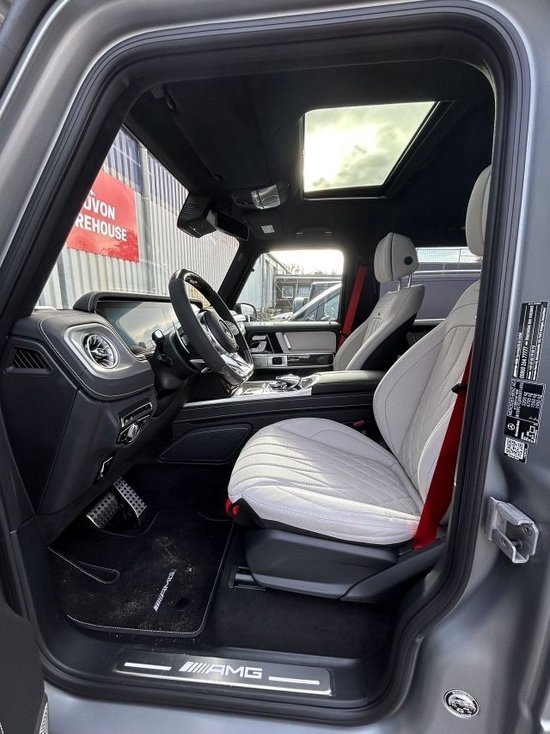 2023款奔驰G级AMG G 63车内越野气息十足,多处硬朗设计使其具有硬派越野车风格。采用现下流行的双连屏设计,让车内还具有一些科技感。双连屏界面显示清晰,易读性不错。方向盘为三辐式式设计,除了常见的功能按键区域之外,还在下方加设了一些按钮,驾驶仪式感十足,也可以让驾驶员专注力提升,不分神去操作其他功能。方向盘支持各种导航、电话、以及娱乐功能的控制按键。中控区域还采用了AMG车型独有的模拟时钟IWC设计,时钟中的数字和指针均采用纯金属材质,质感不错。