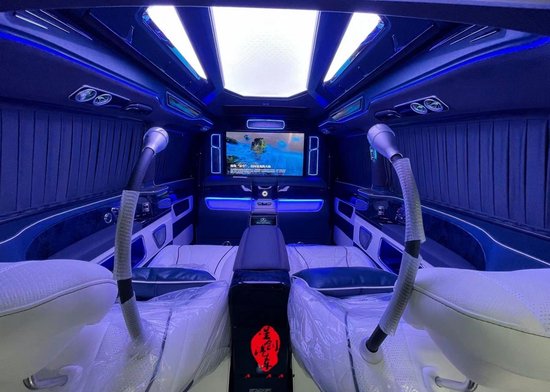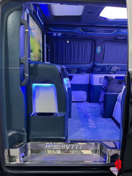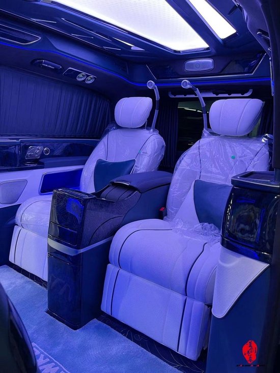 进口奔驰V260商务车航空座椅控制屏,一手掌控整个2024款进口奔驰V260改装商务房车的舱内电器,随意控制,驾驭生活。贵宾区电动侧滑门开启,超大空间安置豪华坐席,既可前后旋转,轻松变换为多人会议模式。