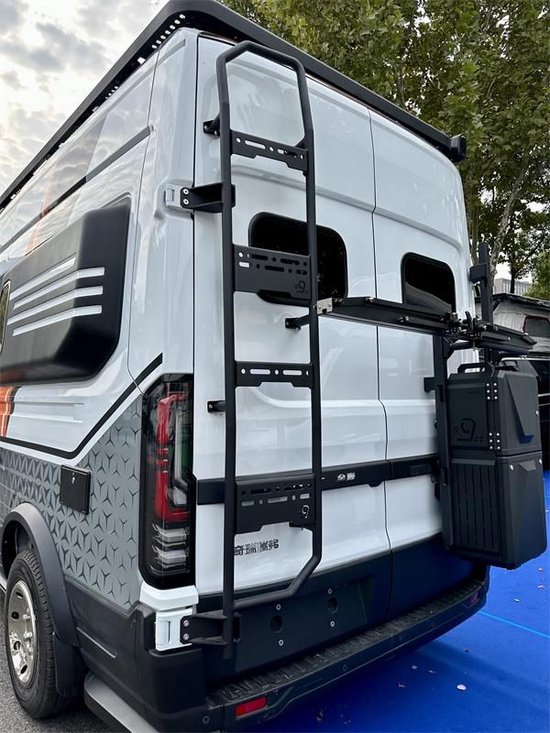 车辆尾部重新开模定制了爬梯,增加了更多固定点,提高爬梯的安全性和稳固性。右侧的背包则采用的是柴油灶的设计,保障户外露营时能带给车友
