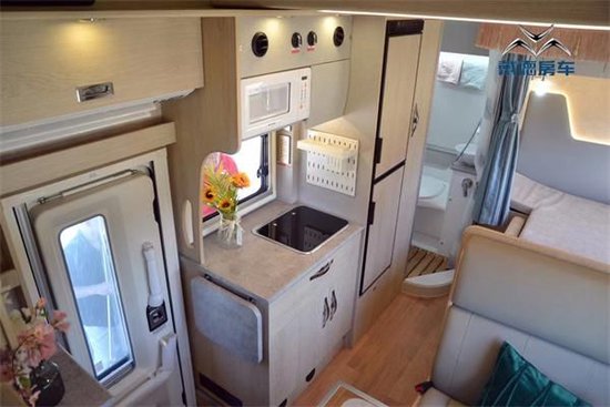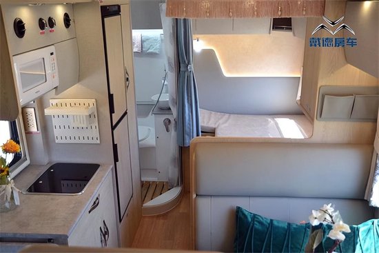 驾驶舱内主副座椅和方向盘均采用NAPPA真皮包裹,触感细腻,气减式座椅可吸收行驶至颠簸路段的晃动颠簸感。标配有环车影像系统,车身周围配备有4枚摄像头,可以将捕捉到的影像回馈到驾驶舱内的流媒体后视镜内,方便驾驶员及时了解掌握周围的情况,行车驾驶更安全。 车内装饰深棕搭配米白,精致典雅,旅居生活更舒适温馨,虽为无拓展结构,得益于科学合理的布局,空间也足够宽阔,高端生活从踏入车内的一刻即开始。
