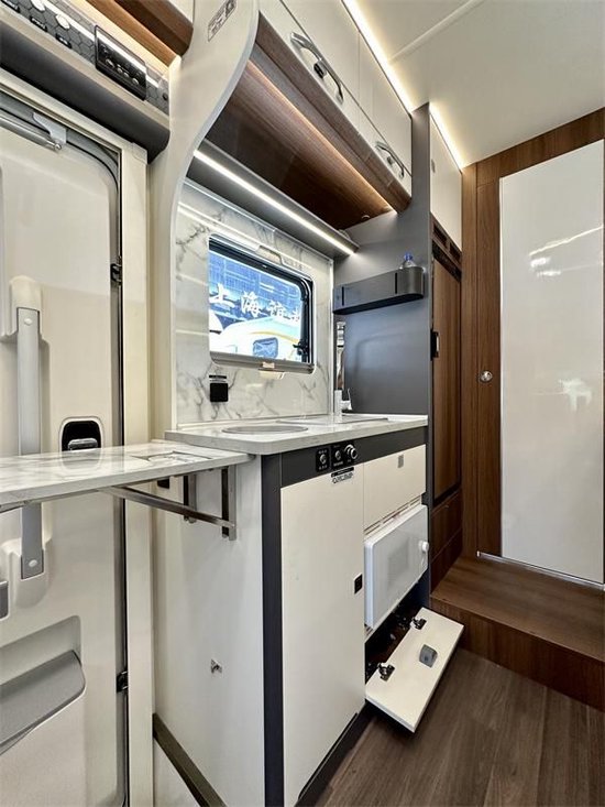 整体现代简约的内饰风格搭配布局设计,采用E0级房车家具板材,搭配胡桃木色柜门,配有暖色的氛围灯和主灯,舒适而柔和。给您带来一个温馨的家。 客休区的布局基本和传统房车一样采用,L 型的卡座沙发搭配轿车式的沙发造型,凸显品质。副驾驶的座椅支持角度旋转,与客休区形成更大的交流区,闲适洽谈、悠适生活,瑞弗的客休区的沙发与大多是房车不同它是个体的更倾向与MPV车型的座椅更符合人体工程学,乘坐更舒适,安全系数也相对更高。中间的课桌采用大理石面板的造型,更显高级,配备一个大面积的推窗,旅行中靠着沙发看着窗外的风景惬意的前往下一站。