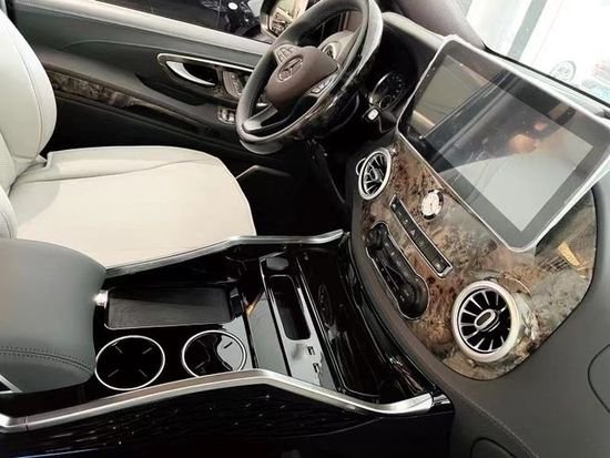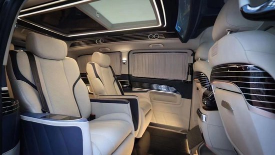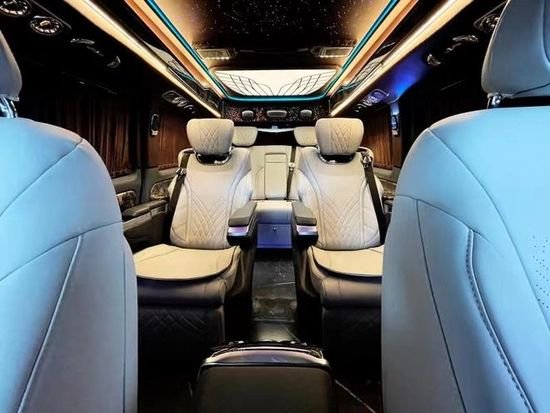 全新奔驰威霆2+2+3座椅陈列,也是商务车最为流行的座椅布局,第二排航空座椅,打孔真皮处置更透气,座椅透风、推拿赐与您更温馨的乘坐感触,更有360度扭转功用;奔驰威霆7座商务车无论是家庭出游照顾孩子、陪家人谈天,亦或是商务洽谈,都能让您随心所欲。在奔驰威霆主副驾驶座椅后方安装有手动小桌板,可承重10公斤,文娱影音配备齐全,24寸高清固定式液晶电视,需求时可随时开启,配合进口丹拿音响,这就是传说中的移动家庭影院,最主要的内饰就是座椅。在改装后奔驰奔驰威霆车顶设计上也富有层次感,灯光采用碎钻搭配,使整车内部空间氛围温馨且大气,而且在造型上也是亮点突出,三款时钟搭配,无时无刻都在彰显奔驰威霆改装商务车高顶版的豪华非凡。