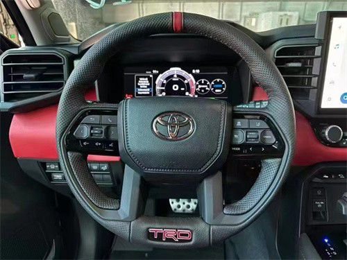 23款丰田红杉四辐式多功能方向盘、并保留了很多物理按键、足以满足驾驶时想要的操控感、车内的科技氛围是通过12.3英寸的全液晶仪表盘和14英寸的中控屏来实现的、 中控屏两侧的空调出风口、虽然没有采用时下流行的贯通式设计、但在中控台上对称排列也别有一番风味。