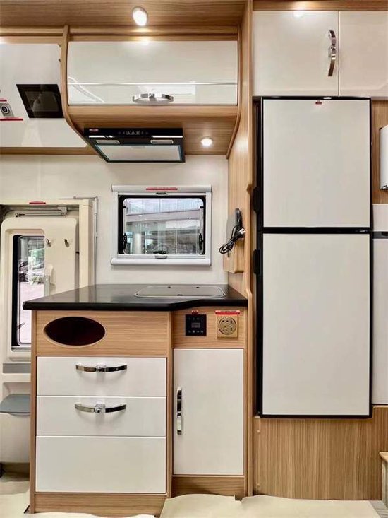 厨房区配备有翻盖式洗菜池、可抽拉式燃油灶带水槽、房车专用抽油烟机等。在厨房区一侧,配备有170L 超大容量车载冰箱,拥有充裕的储藏空间方便用户分区冷藏或冷冻食物