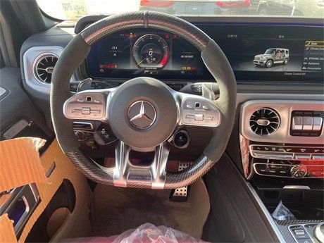 奔驰G63内饰即豪华又充满科技感,中控台多处均采用碳纤维材质覆盖,带彩色TFT显示屏的AMG仪表盘、AMG主菜单和单独的挡位显示器以及采用白色照明的AMG门槛。名贵的选材及精湛的打造都令人拍案叫绝。双12.3英寸贯穿式的显示屏营造出了浓郁的科技氛围。当然了,经典的“三把锁”按键自然不会缺席,并且设置在中控台最为显眼的位置。