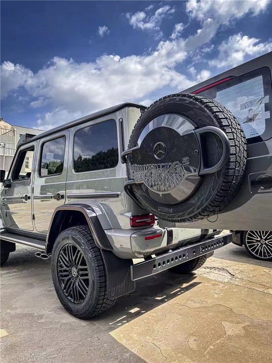 23款奔驰G63 4X4加宽了轮眉,新增加了车顶行李架,并还设置了专门的梯子可以方便拿取行李,尾部备胎也看上去更大,整个新车离地间隙变得更高,尾部还新增了一个辅助保险杠。肉眼可见的越野性能全面提升。