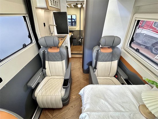 车内风林内饰风格,豪华拼接纹木地板,一看看上去就有居家高级风格。车内最显眼的就是这两个豪华的航空座椅了,通风,加热,按摩,腿托的功能都具备,真皮包覆,力求乘坐感舒适,即使长途旅行,乘坐也不会累。前面可以拆卸的桌板,简洁,需要的时候日常办公,放电脑,吃饭当餐桌,都是没问题的,不需要的时候卸下来,也不影响其他。