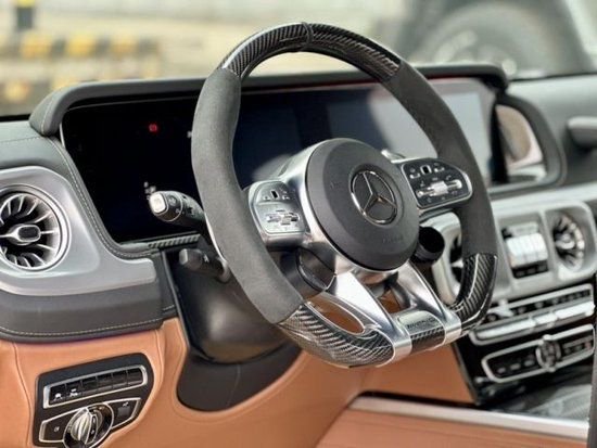 2023款奔驰G63车内用料以豪华为主,部分碳纤维及铝合金装饰件。如今的G级是纯粹的豪华车了跟那些纯粹越野车不一样的,车内配置很高像这个座椅除了各种电动调节功能外,还带有腰托、腿托以及加热、通风、记忆功能。此外,全液晶仪表盘+中控大屏的双12.3英寸屏幕设计在新车上也没有缺席,营造出了浓郁的科技感。