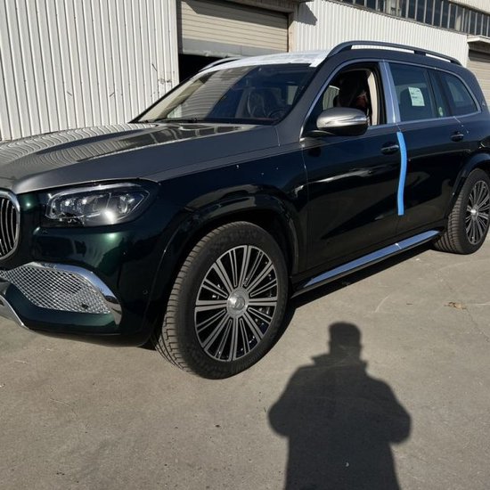 迈巴赫GLS600车身侧面,新车采用双色车漆喷涂,配备23英寸多幅熏黑轮毂,D柱之上镶嵌迈巴赫专属LOGO,同时车窗周边的镀铬装饰也凸显了尊贵的身份,整体的车身设计简洁而干练。车尾也采用了大量的镀铬装饰,GLS 600和Maybach英文标识所使用的字体样式相比以往车型质感更强。