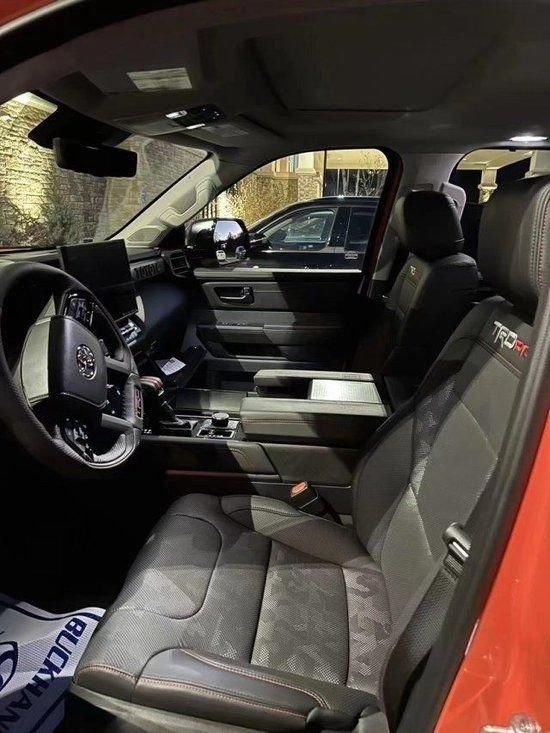 2023丰田红杉TRD Pro 配置:I-Force Max V6双涡轮油混发动机,10速变速箱,多项驾驶模式选择带拖拽模式,地形反馈带蠕行模式,分时四驱系统,前悬架螺旋弹簧,多连杆后悬架,后电子差速锁,TRD Pro越野悬架,红色TRD Pro前稳定杆,Fox氮气减震,TRD Pro双排气。18寸BBS专属亚光轮毂带红色TRD Pro标志,TRD铝制运动踏板,LED日间行车灯带自动开关调平,LED雾灯,顺序转向尾灯,机盖TRD Pro灯,黑色TOYOTA字样前进气格栅带TRD Pro灯条套件,TRD铝制保护板,胎压监测,巡航定速,车道跟随,自动远光,盲点辅助,前后驻车辅助系统,电动后视镜带加热,隔音挡风玻璃,隐私玻璃。14英寸带有8扬声器音频系统的ToyotaAudio多媒体触摸屏,无线安卓和苹果Carplay兼容,SiriusXM,JBL音响带14扬声器,12.3寸液晶仪表盘带TRD Pro仪表盘徽章,10寸抬头显示,360环影,三区空调,智能卡带红色一键启动,红色换挡旋钮,真皮方向盘带TRD Pro标志,副驾驶TOYOTA装饰,7座TRD Pro SofTex饰边座椅带二排船长座椅,TRD Pro全气候脚垫,头枕可调,8向电动可调驾驶员和前排乘客座椅带通风、加热及座椅记忆,可调节行李隔板,两段式电尾门带镀铬SEQUOIA徽章
