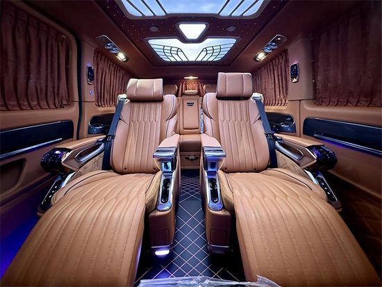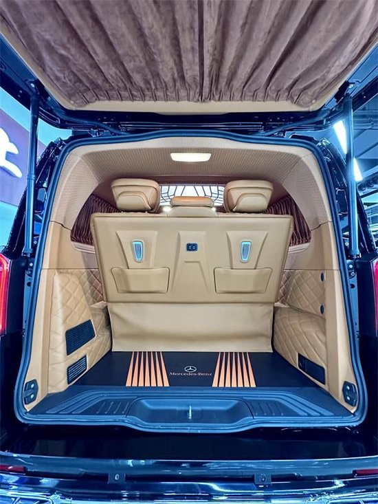奔驰威霆改装无隔断七座商务车第二排座椅采用两个62S首长级座椅,带加热,按摩,通风,一键式电动调节记忆等功能。奔驰威霆改装七座无隔断座椅符合人体工程学设计,同时带有电动椅背调节,电动头枕,电动前后调节,180°旋转,一键式伸缩腿托功能,带来头等舱级舒适体验,,私家客厅级后舱体验,180°旋转后可以与第三排电动沙发床进行无缝拼接,满足两个成年人一个小孩的正常休息,带来卧室级舒适享受。