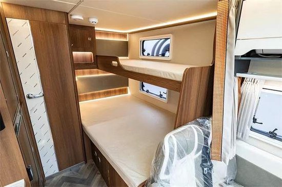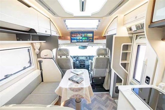 小额头是T型房车最大的特点,完美地将高度控制在3米以内,保持一个很好的通过性,许多限高区域都可以行驶,对于小额头的设计,额头内仅做出储物空间,并在边缘悬挂液晶电视。整体式客厅占据车体前部空间而在此款T800身上也得以体现。外观颜色仍然沿用白色为主的设计,加上一些黑色红色的拉花元素增加美观度。