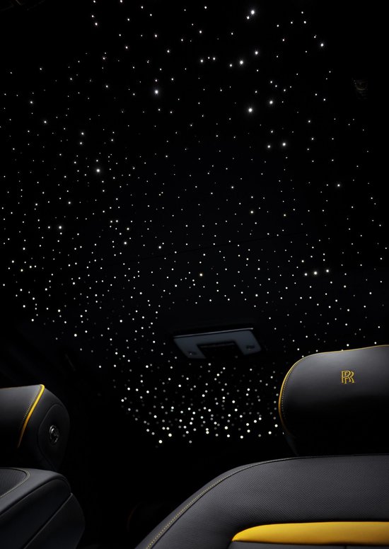在Black Badge库里南中,奢华真皮座椅上的星空车顶,作为新增的柔和光源,强化了车内的氛围。黑色真皮配合1344根独立光纤手工编织其中,绝妙还原了夜晚的星空。八颗绚丽的白色流星随机地在车顶划过,前排乘客的头顶出现流星的概率更大,十分巧妙地体现出这辆车对喜爱自主驾驶的客户的吸引力。