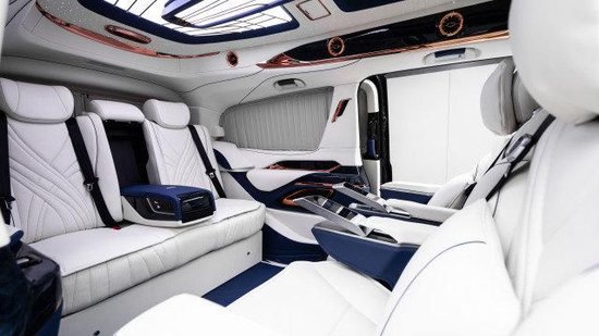 2023款奔驰V250商务车内饰方面同样做了整体的升级,中控台、方向盘、门板、车侧壁、车顶、进门的踏步整体升级包覆。正副驾驶座椅升级包覆、正副驾驶座椅中间加装车载扶手冰箱、正副驾驶座椅头顶定制宽屏车载网络电视、正副驾驶座椅椅背后方加装可伸缩的小桌板。第二排座椅升级成两个独立的航空座椅,航空座椅带多向电动调节功能,带通风、加热、按摩等舒适功能、同时航空座椅还带有选装功能,旋转之后可与第三排座椅形成对坐状态。第三排座椅升级成宽大舒适的三联排沙发床,可电动调节、前后移动,靠背可180度放平平卧。