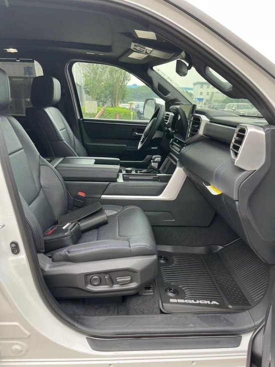 2023款丰田红杉内饰的实用性与空间利用率在这代红杉身上均得到提升,坐进车内,第一感受就是大,前排的两个大尺寸的真皮座椅,自带打孔透气皮料,四幅式多功能方向盘,握在手里的质感不错,转向也没有想象那么重,T型的中控平台,尺寸方面也比一般车型大不少,14英寸的中控触摸屏,集成了几乎所有的影音娱乐以及车身控制功能。座椅通风加热按摩,第二排独立座椅设计,第三排的空间上提升得尤为明显,三排座可以用大沙发来形容。
