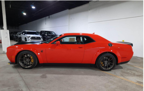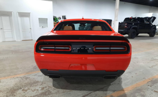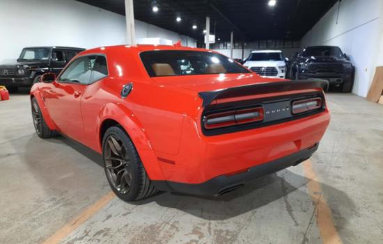 道奇挑战者 SRT地狱猫外观方面,新车延续了挑战者家族车型十分硬朗、十分具有力量感的美式肌肉车风格。同时,新车还在普通版车型的基础之上,增加了一套宽体套件,这套套件主要是针对其轮眉进行了加宽,相对于普通版车型整体增加了3.5英寸(88.9mm),能够让新车使用更宽的车胎。此外,新车还将提供13种不同的车身颜色,并提供多种车身拉花供消费者选择。