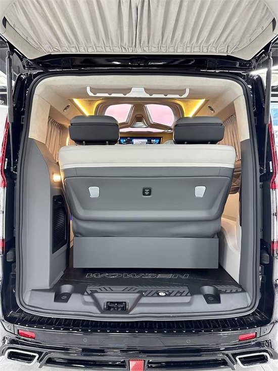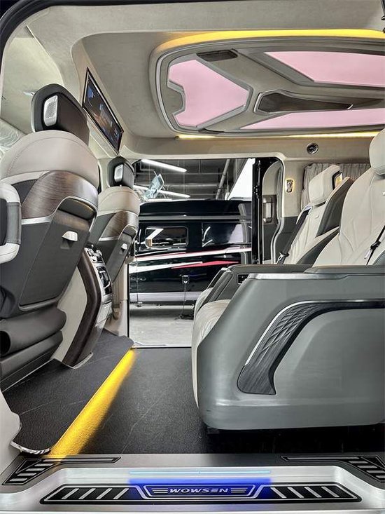 地板上用的是航空铝材的地板,表面的岩石花纹图样,很好打理,款式也不错。驾驶舱的靠背小桌板,后方的五孔插座,USB接口,无线充电,也都有安排上。顶部无线网络电视机,车子WiFi手机热点都可以直接连接使用,而且整车还升级了音响,用的是VV-car影院级别的环绕音响,坐在车内,试听感受很赞。