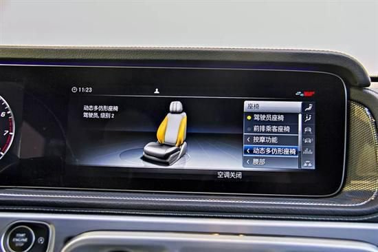 12.3寸双大屏就不用太多介绍了,炫、实用、科技感十足,不过唯一不足就是不支持触控。尽管Comand系统操作并不算难用,但是仍感觉不如直接触控来的方便。当然为了进一步提升豪华感“柏林之声”音响第一次出现在G级身上,您上车就会变得很纠结了:我是到底听V8排气声浪?还是听乐音呢?当然为了隔音更出色,这代奔驰G级前排使用双层玻璃,车内隔音效果更好。