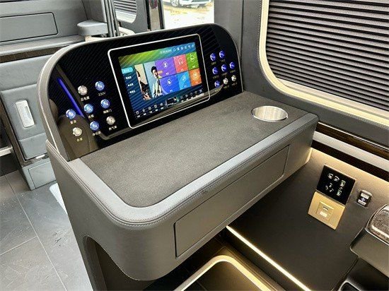 丰田考斯特12座改装商务车,除了座椅的改装以外,车内隔断的增加也是别有一番风味的,隔断的增加,将驾驶席和乘客席分开而设,同时我们可以在隔断上增加一些精美的装置,电子时钟,或者显示屏,方便有使用。隔断的效果最主要还是分离了司机和乘客,既能够给司机一个安静的驾驶环境,同样也为乘驾人员提供了更加静谧的乘车空间。