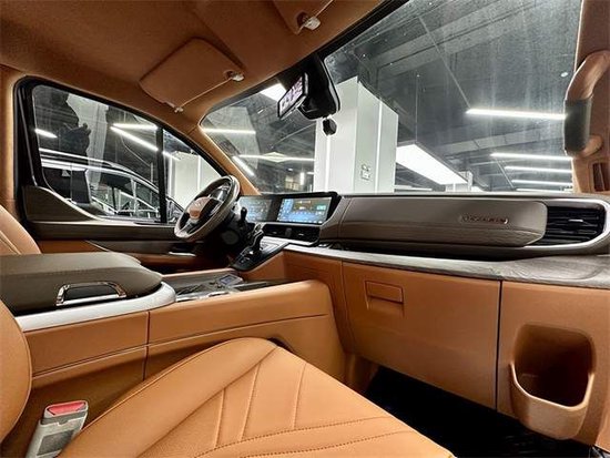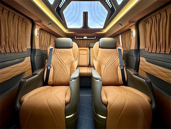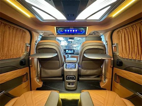 商务舱是一个大理石的地板,耐磨好看又易打理。靠背小桌板他也有无线网络,电视机他还有。独家定制的高达顶灯,多款颜色可以随意地切换,氛围感十足。整车在音响上做了一个非常大的升级,用的是VV car的9.1声道的音响还带有GPS处理器。想在车内听听歌看看电视,或者是再唱两首歌,感觉就上来了。