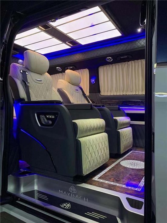 第二排使用升级后的航空座椅,该座椅已从原来的半延伸躲避改为全方位延伸的腿托。并带有迈巴赫梅赛德斯标志。座椅具备以下功能:加热,按摩,通风,前后电动调节,靠背电动调节,360度电动旋转调节,电动升降腿托,电动头枕升降电动调节,USB接口,一键式座椅记忆功能,全身设计理念的完美应用加上迈巴赫手工绣花枕头。